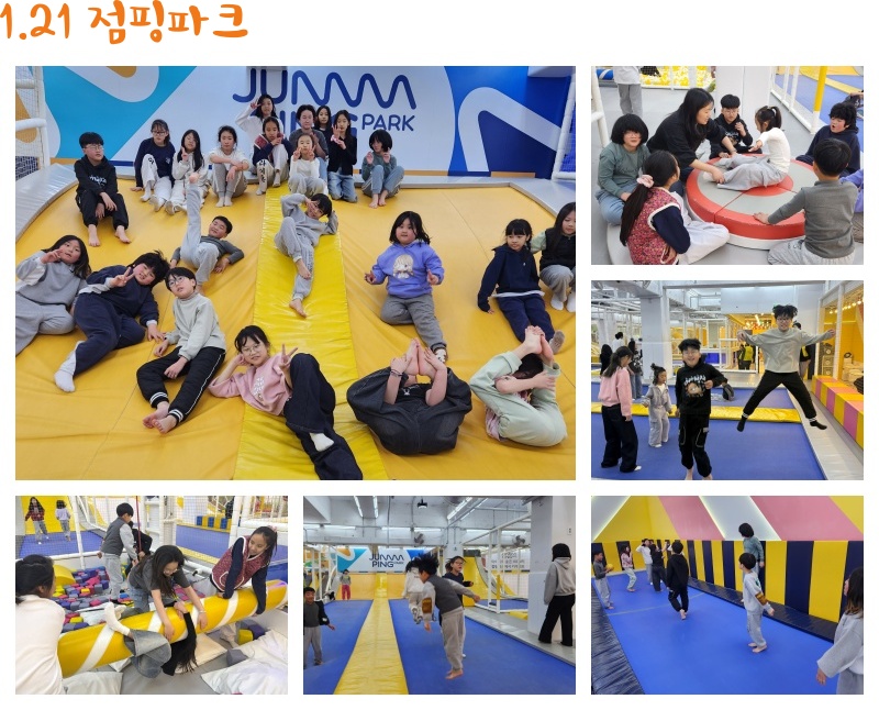 점핑파크에 다녀왔습니다. 점프, 트램펄린, 주방놀이, 낚시놀이, 공매 달리기, 집라인, 클라이밍, 피구 등 다양한 놀이를 하며 신나게 뛰어 놀며 스트레스를 시원하게 날리고 왔습니다.
